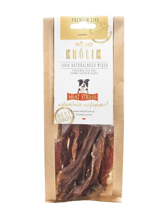 Szukasz delikatnej i zdrowej nagrody dla swojego psa? Królik w paskach Milord to naturalny, hipoalergiczny przysmak dla psów w każdym wieku i każdej rasy. Wytworzony w 100% z mięsa mięśniowego królika, bez zbóż, konserwantów i sztucznych dodatków. Suszony ciepłym powietrzem, zachowuje pełnię wartości odżywczych i naturalny smak. Produkowany w Polsce pod nadzorem inspekcji weterynaryjnej.