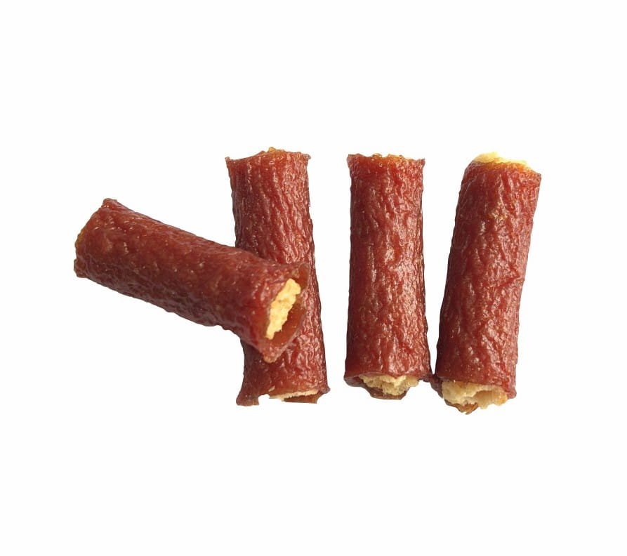 Skład: pierś z kurczaka 69,6%, pierś z indyka 9,6%, mąka ryżowa 7,8%, gliceryna 6,4%, sorbitol 2,9%, mączka z kurczaka 2,1%, chlorek sodu 1,6%, naturalne barwniki 1%.