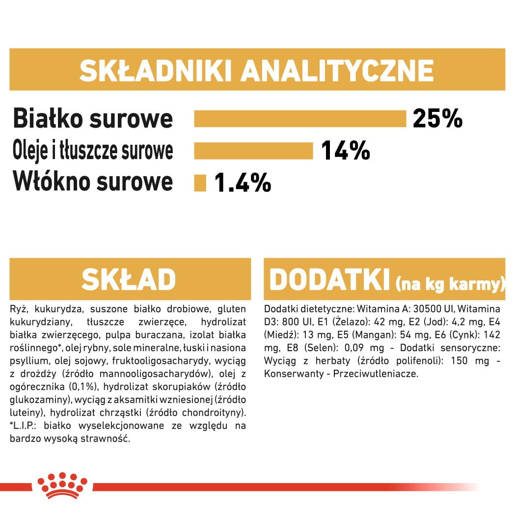 Skład: ryż, kukurydza, suszone białko drobiowe, gluten kukurydziany, tłuszcze zwierzęce, hydrolizat białka zwierzęcego, pulpa buraczana, izolat białka roślinnego*, olej rybny, sole mineralne, łuski i nasiona psyllium, olej sojowy, fruktooligosacharydy, wyciąg z drożdży (źródło mannooligosacharydów), olej z ogórecznika (0,1%), hydrolizat skorupiaków (źródło glukozaminy), wyciąg z aksamitki wzniesionej (źródło luteiny), hydrolizat chrząstki (źródło chondroityny).