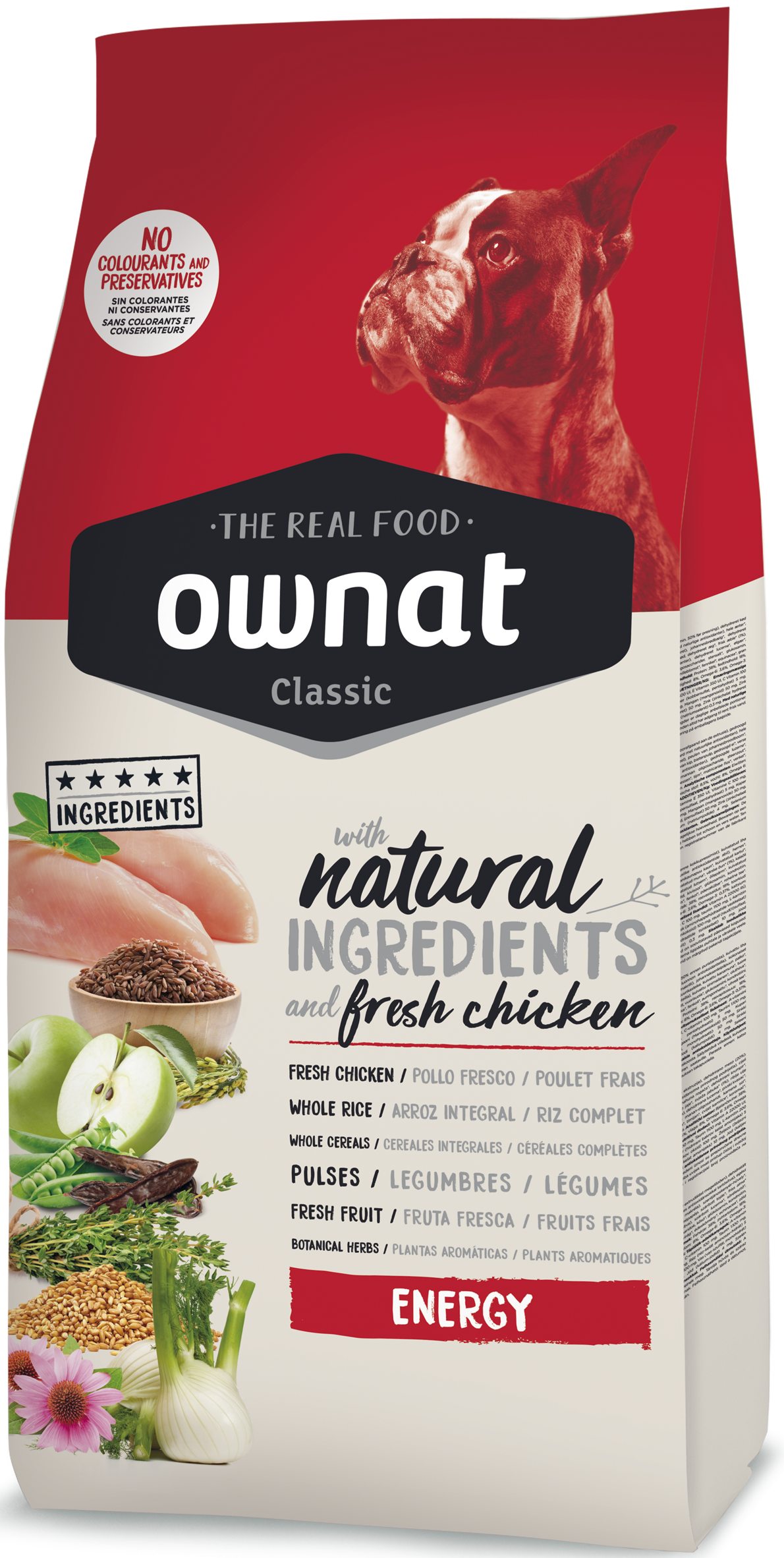 Ownat Dog Energy (dawniej Optima Energy) karma dla psa, ze świeżym mięsem, stworzona by zaspokoić wymagania żywieniowe dorosłych psów o wysokiej aktywności fizycznej, psów pracujących i sportowych, bez względu na wielkość i rasę. Bogata w tłuszcze będące zbilansowanym i łatwo przyswajalnym źródłem energii. Wysoka zawartość białek zapobiega utracie masy mięśniowej.