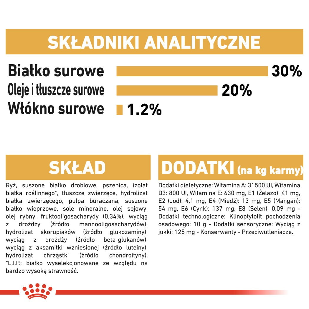 Skład: Ryż, suszone białko drobiowe, izolat białka roślinnego*, pszenica, tłuszcze zwierzęce, hydrolizat białka zwierzęcego, pulpa buraczana, sole mineralne, suszone białko wieprzowe, olej sojowy, olej rybny, fruktooligosacharydy, wyciąg z drożdży (źródło mannooligosacharydów), hydrolizat skorupiaków (źródło glukozaminy), wyciąg z aksamitki wzniesionej (źródło luteiny), hydrolizat chrząstki (źródło chondroityny).