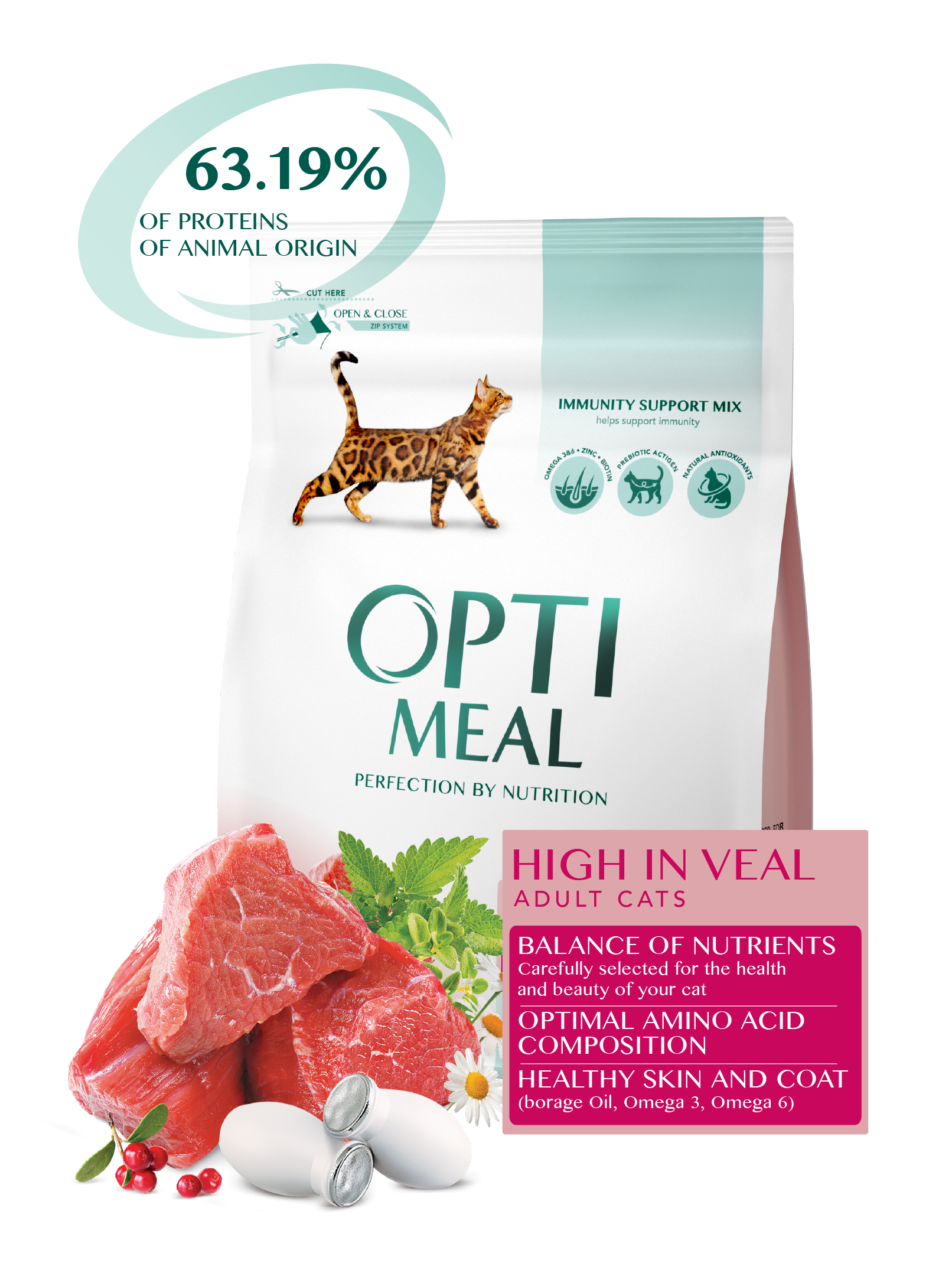 Optimeal dla dorosłych kotów z cielęciną — super premium żywność dla dorosłych kotów, produkowana pod kontrolą lekarzy weterynarii. Wyjątkowa receptura dla zdrowia i urody zwierzęcia zawiera wyselekcjonowane mięsne składniki, przydatne zioła, jagody, naturalne przeciwutleniacze i prebiotyki.