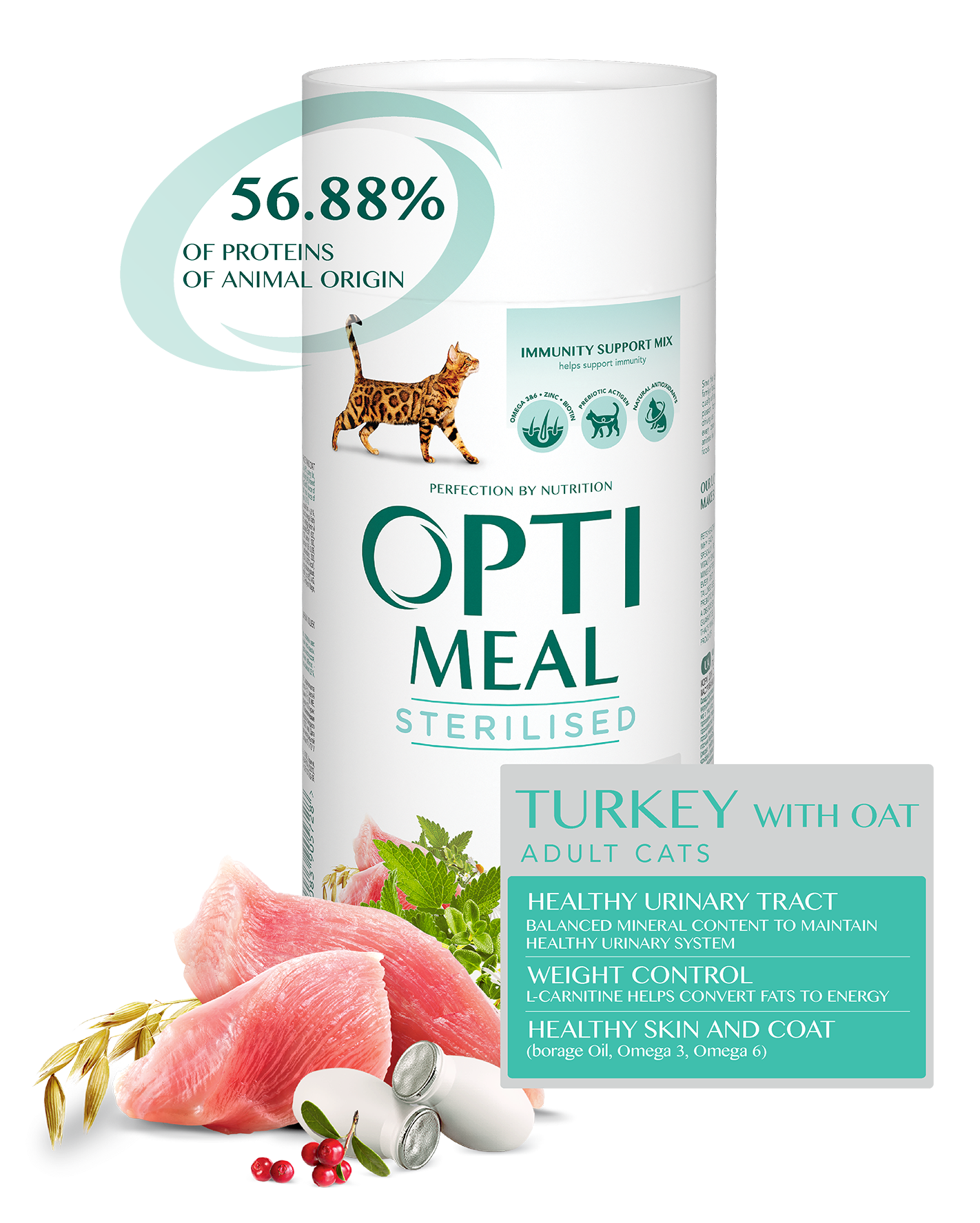 Optimeal dla wykastrowanych kotów oraz sterylizowanych kotek z indykiem i owsem — super premium żywność dla wykastrowanego kota oraz sterylizowanej kotki, produkowana pod kontrolą lekarzy weterynarii. Wyjątkowa receptura dla zdrowia i urody zwierzęcia zawiera wyselekcjonowane mięsne składniki, przydatne zioła, jagody, naturalne przeciwutleniacze i prebiotyki.