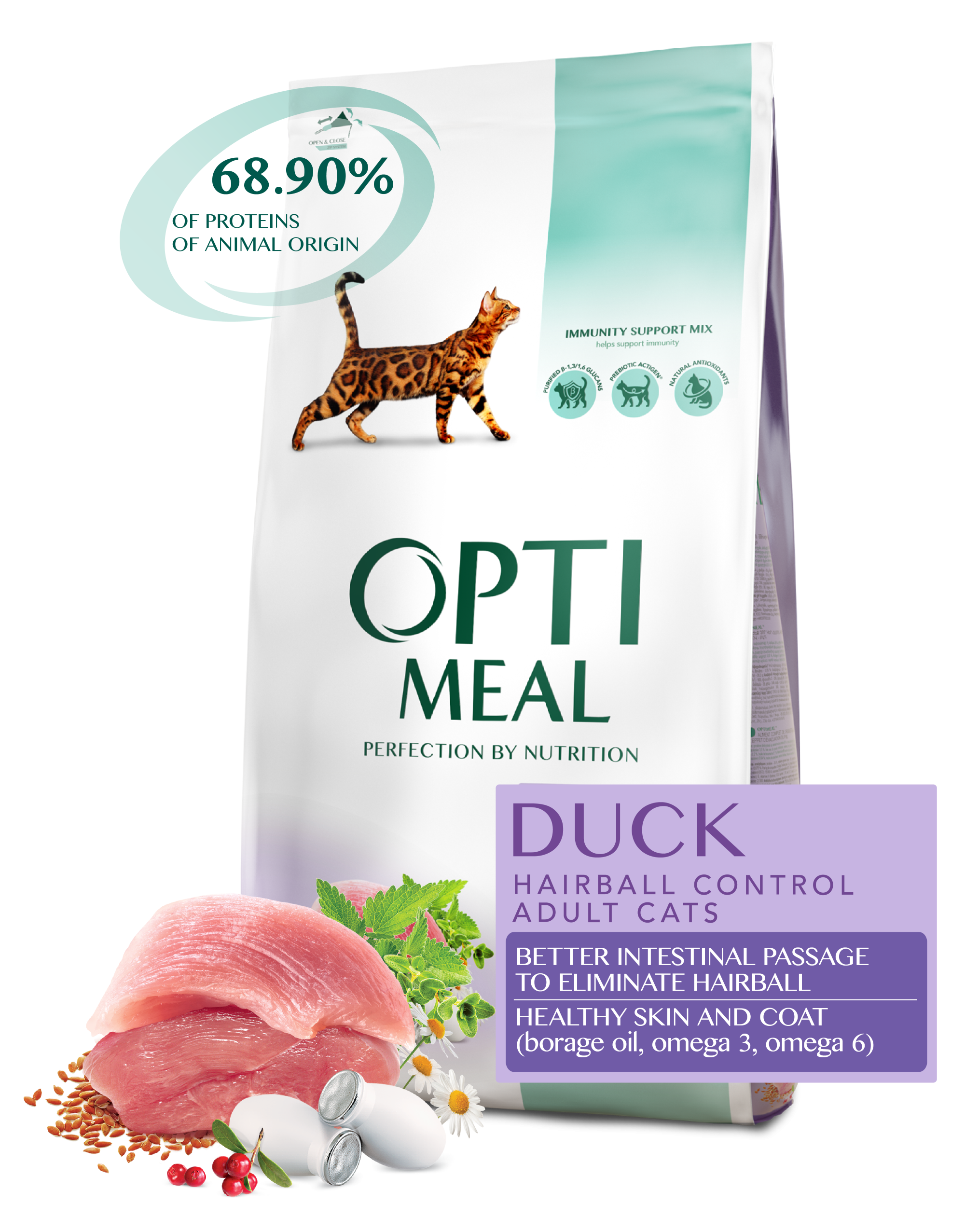 OPTIMEAL Hairball z kaczką to karma super premium dla Twojego pupila, opracowana pod nadzorem weterynarzy.
