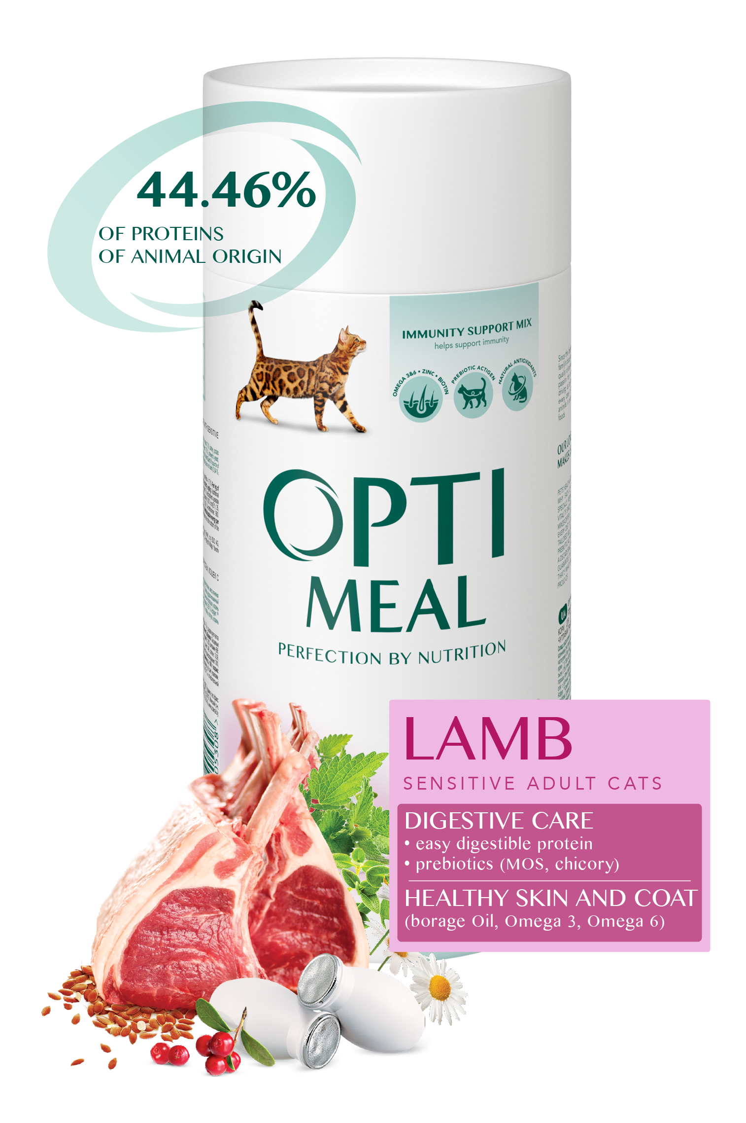 Optimeal dla dorosłych kotów z wrażliwym trawieniem - jagnięcina — super premium karma dla dorosłych kotów, produkowana pod kontrolą lekarzy weterynarii. Wyjątkowa receptura dla zdrowia i urody zwierzęcia zawiera wyselekcjonowane mięsne składniki, przydatne zioła, jagody, naturalne przeciwutleniacze i prebiotyki.