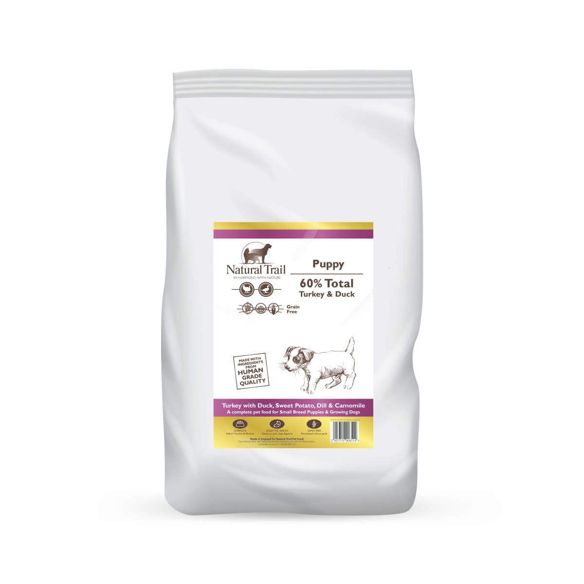 Natural Trail Turkey & Duck 60% Puppy all Breed, karma przygotowana z mięsa indyka i kaczki, dla szczeniąt małych ras.