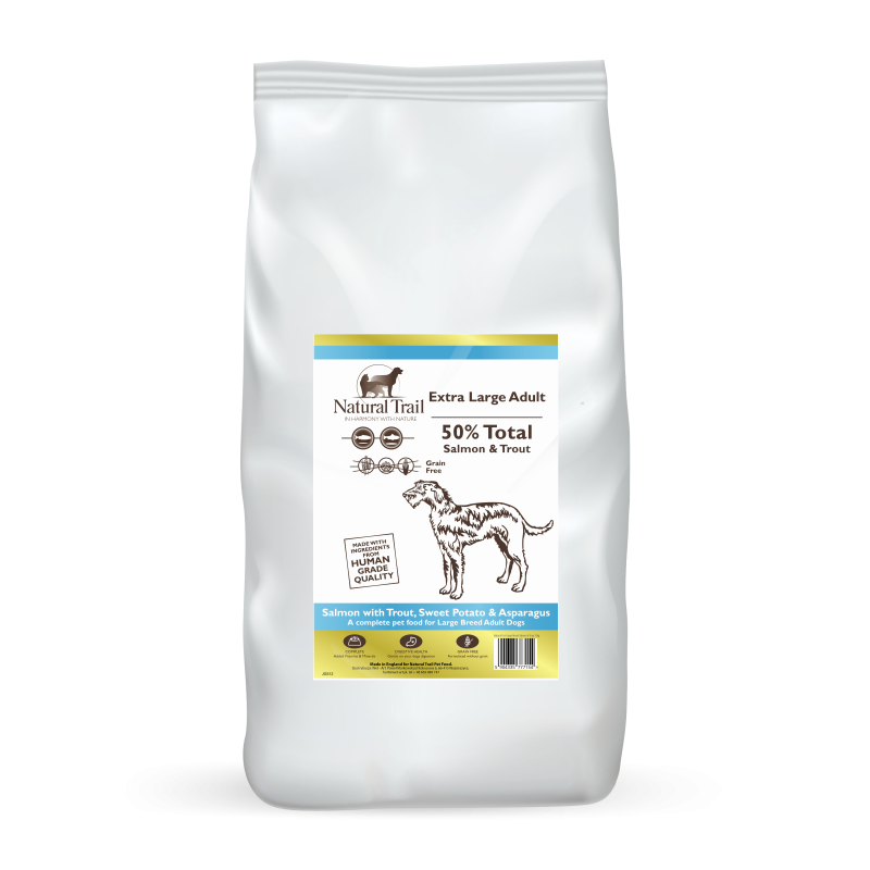 Natural Trail Salmon&Trout 50% Large Breed, karma przygotowana wyłącznie z mięsa łososia i pstrąga, dla dorosłych psów największych ras.