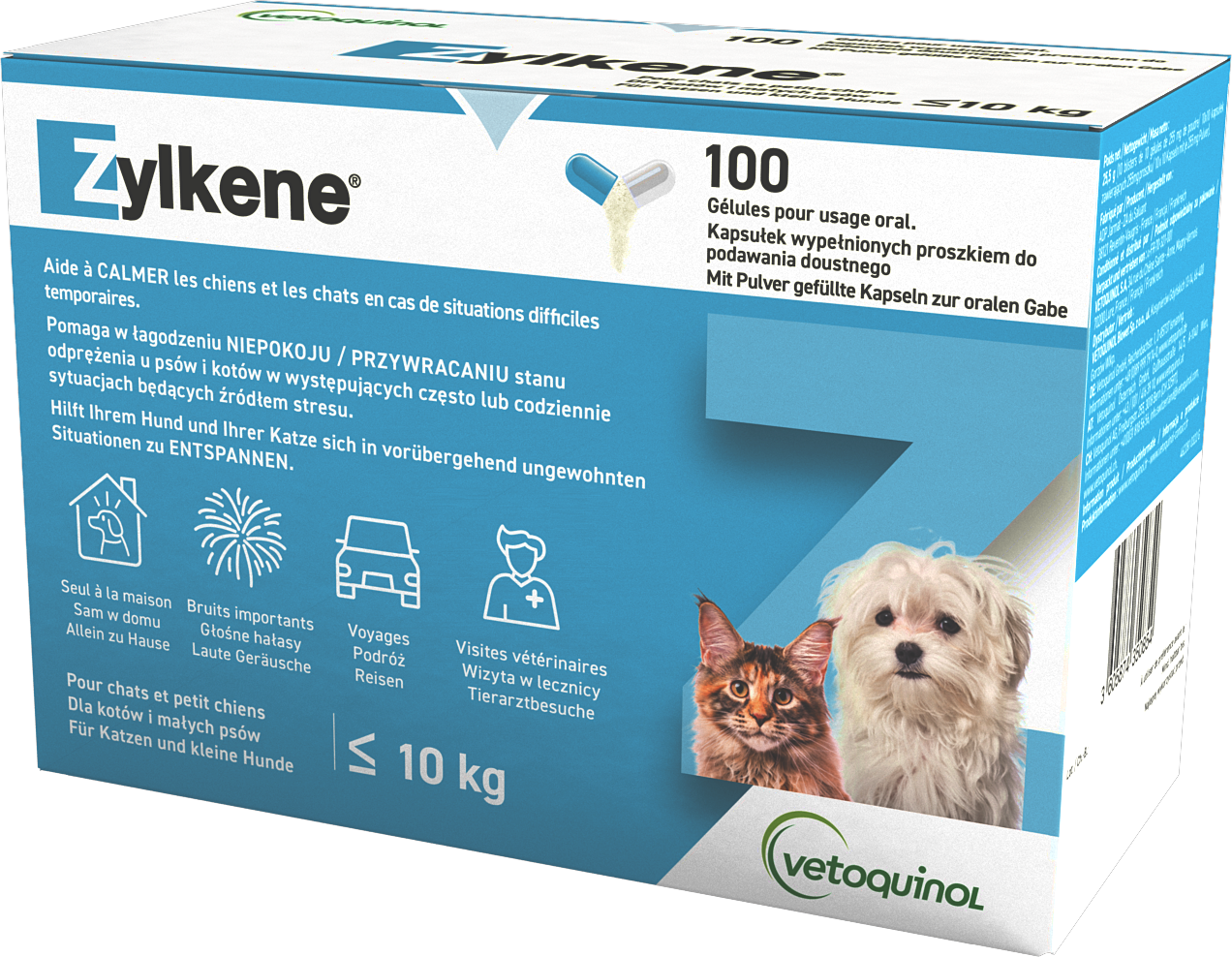 STOSOWANIE: kapsułki Zylkene ® zawierają składnik naturalnego pochodzenia o potwierdzonym działaniu polegającym na łagodzeniu niepokoju / przywracaniu stanu odprężenia otrzymywany z występującego w mleku białka o nazwie kazeina. Podawanie produktu psom i kotom należy rozpocząć przed spodziewanym zdarzeniem takim jak zmiana otoczenia, pozostawienie samemu, przeprowadzka do nowego domu, pojawienie się nowych osób lub zwierząt, odsadzanie, podróż, fajerwerki lub zaburzenia typowego rytmu dnia pupila.